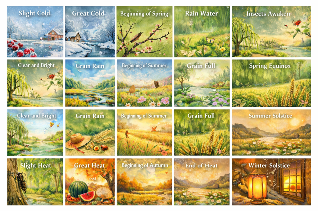 Think of them as 24 mini seasons. Imagine the 4 Seasons as your map, but the 24 Solar Terms are your map key. This system started as a guide for farmers to ensure a good harvest. Ancient farmers couldn’t afford to guess. Planting seeds too early – They would freeze. Too late – They would miss the harvest window.